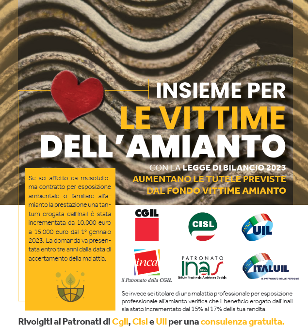 Se sei affetto da mesotelioma contratto per esposizione ambientale o familiare all’amianto la prestazione una tantum erogata dall’Inail è stata incrementata da 10.000 euro a 15.000 euro dal 1° gennaio 2023. La domanda va presentata entro tre anni dalla data di accertamento della malattia.